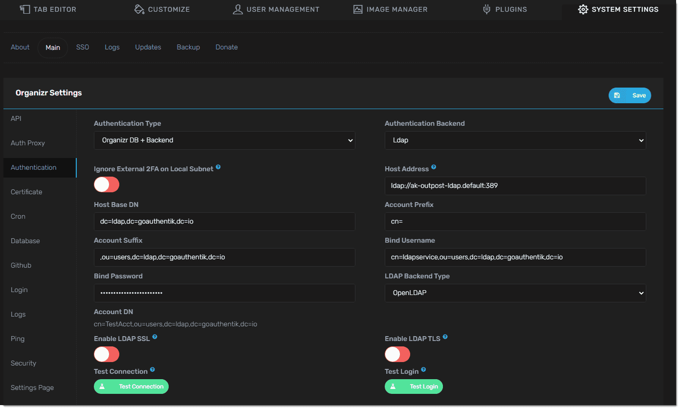 Authentication Type: Organizr DB + Backend Authentication Backend: Ldap Host Address: <LDAP Outpost IP address:port> Host Base DN: dc=ldap,dc=goauthentik,dc=io Account Prefix: cn= Account Suffix: ,ou=users,dc=ldap,dc=goauthentik,dc=io Bind Username: cn=ldapservice,ou=users,dc=ldap,dc=goauthentik,dc=io Bind Password: <LDAP bind account password> LDAP Backend Type: OpenLDAP